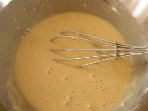 تُسخّن مقلاة على نار متوسطة. يُسكب مقدار ملعقة كبيرة من الخليط في وسط المقلاة لتشكيل دائرة متناسقة.