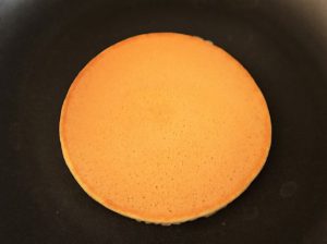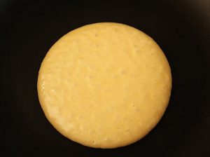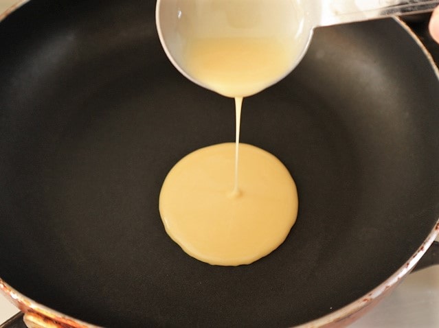 3. Heat a frying pan over medium heat and pour about tablespoon of batter from Step1 onto the pan. Pouring it into the center of the pan will create a neat circle.