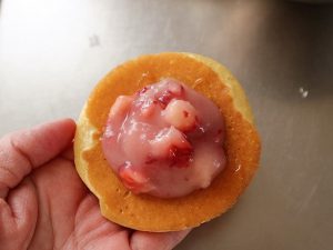 5. Once the pancake from Step 4 has cooled slightly, spread Manuka honey on the inner side, and place the strawberry bean paste (from Step 2) on top.