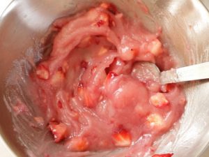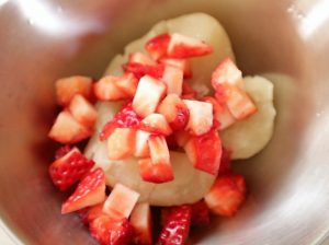 2. Remove the stems from the strawberries and cut them into small pieces. Mix the pieces with the white bean paste to make the strawberry anko.