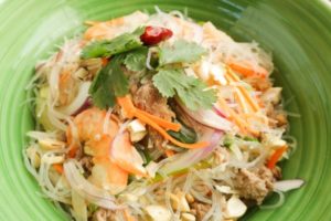 Ingredients (Serves 4):Glass noodles: 60gGround pork: 75gRed chili pepper: 1Garlic (minced): 1 cloveCelery: 1/2 stalkCarrot: 1/2Red onion: 1/4Green onions: 2Dried shri...
