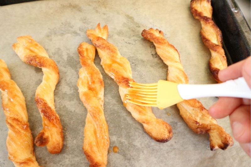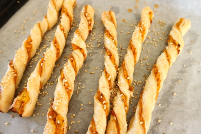 4. Cut the puff pastry sheet lengthwise into 6 equal strips. Twist each strip, sprinkle with white sesame seeds, and bake in the oven at 190°C for 10 minutes.