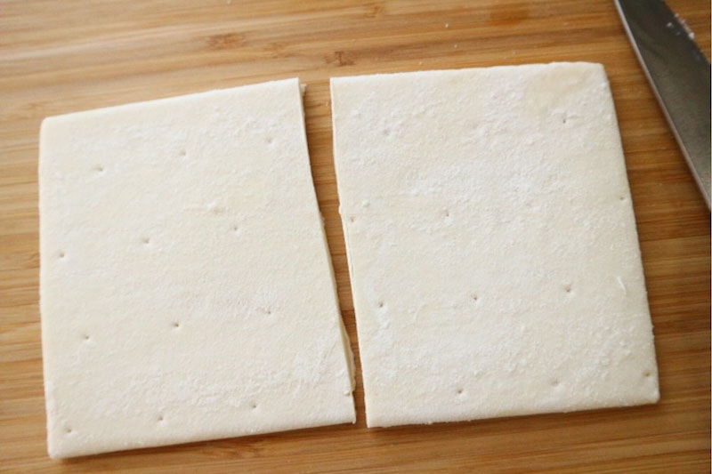 2. Place the puff pastry sheet horizontally and cut it in half. Roll out each piece into a rectangle measuring 15 cm × 10 cm.