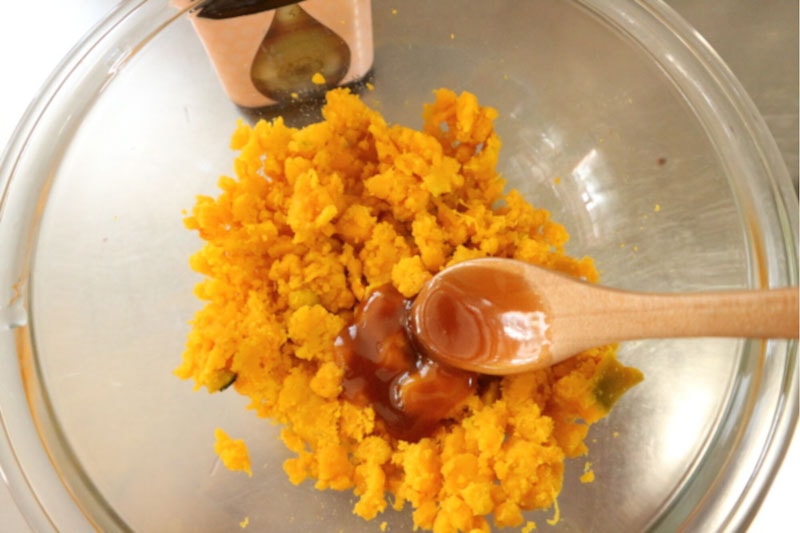 1. Add the ingredients from [A] to the mashed pumpkin and mix well. Allow it to cool slightly.
