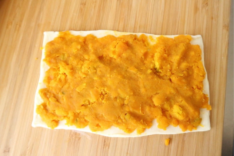 3. Spread the pumpkin mixture from Step 1 onto one of the pastry sheets. Place the second pastry sheet on top, then lightly press them together with a rolling pin to seal.