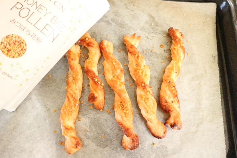 3. Brush the baked strips with the [B] mixture, sprinkle with bee pollen, and return them to the oven for an additional 2–3 minutes at 190°C.