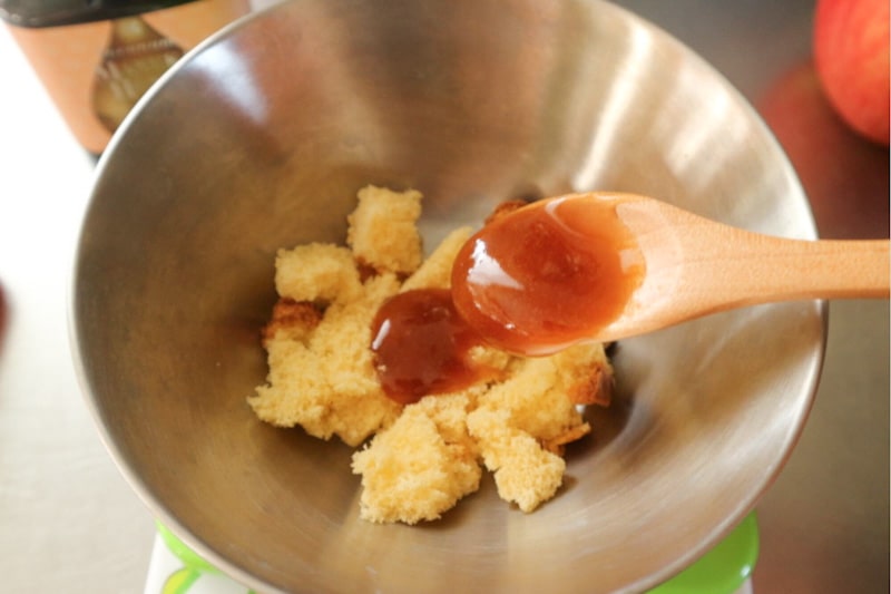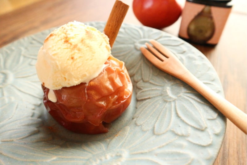 The key is stuffing the apple with Castella cake, which absorbs the juices and creates a harmonious texture with the baked apple.