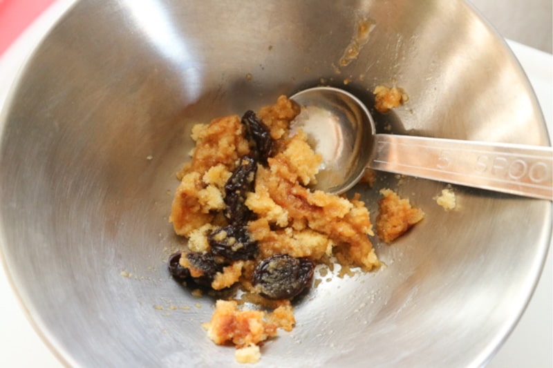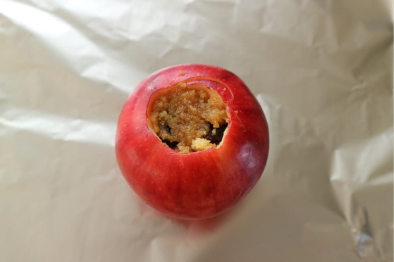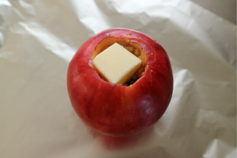 3. Place the apple on a large piece of aluminum foil, stuff the apple from Step 1 with the mixture from Step 2, and top with butter.