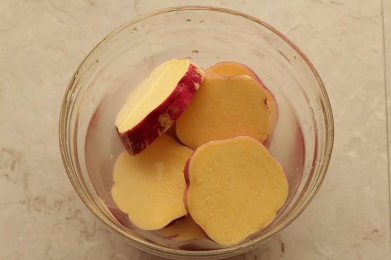Slice the sweet potato into 1cm rounds, soak in water, and microwave at 600W for 2–3 minutes.