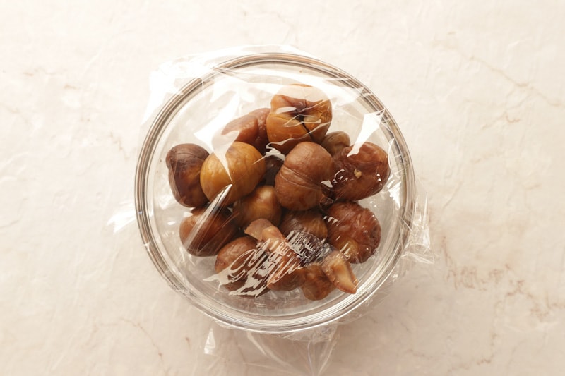 Place sweet chestnuts in a microwave-safe container, cover with plastic wrap, and microwave at 600W for about 1 minute.