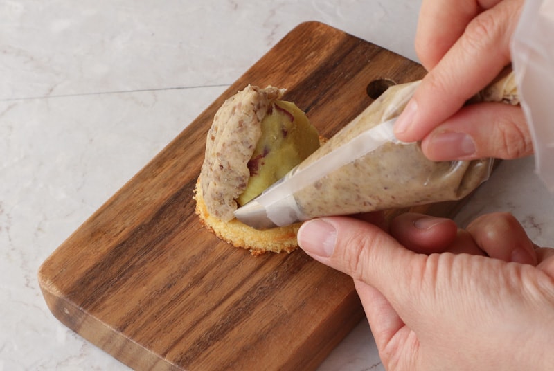 Divide the sweet potato cream into four portions and place each portion on top of a cookie from Step 3, shaping it into a mound.