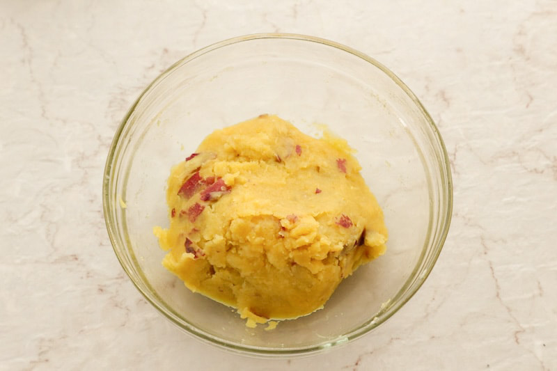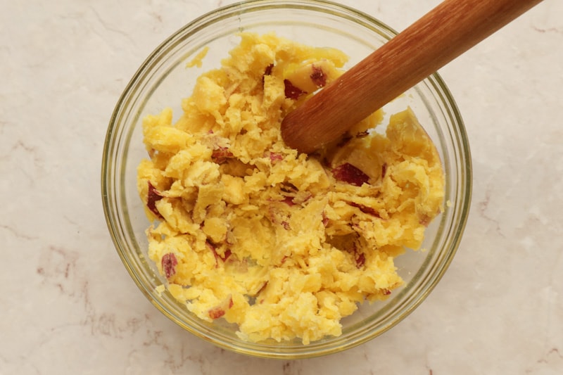 7. Once softened, mash the sweet potato coarsely with a rolling pin and let it cool slightly.