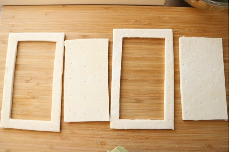 3. One pastry sheet remains whole, while the other two are cut out, leaving a 1 cm border around the edges.