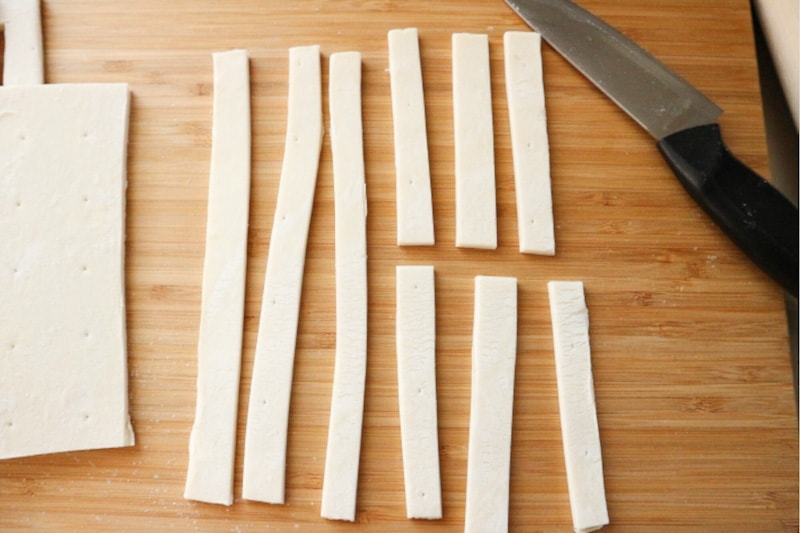 يُلف أحد إطارات العجين ليصل طوله إلى نحو 15 سم، ثم يُقطّع إلى 6 شرائط. تُقسم ثلاثة من هذه الشرائط إلى نصفين لتصبح أقصر. يمكن استخدام بقايا العجين لصنع فطائر أصابع أو مخبوزات صغيرة أخرى.