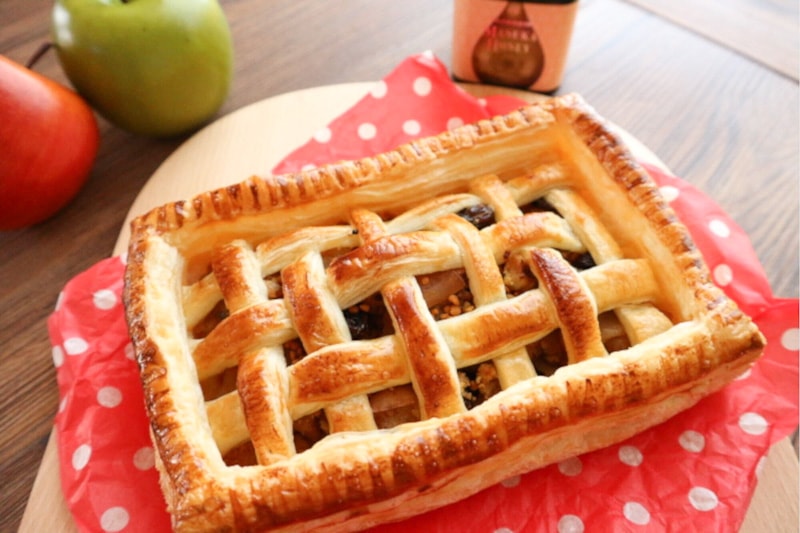 تمتزج حلاوة التفاح المنعشة مع غنى عسل المانوكا، بينما تضيف حبوب لقاح النحل عمقًا خفيف المرارة يوازن النكهة. السرّ الجمالي يكمن في التصميم الشبكي، أما الشكل المستطيل فيمنح كفاءة في استخدام العجين وأناقة لافتة في التقديم—فطيرة بسيطة في جوهرها، فاخرة في حضورها.