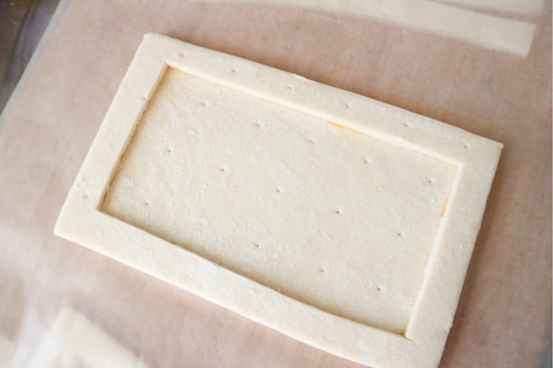 5. Place the uncut puff pastry sheet on a baking tray. Brush the edges with ingredients B and lay one cut border pastry on top.