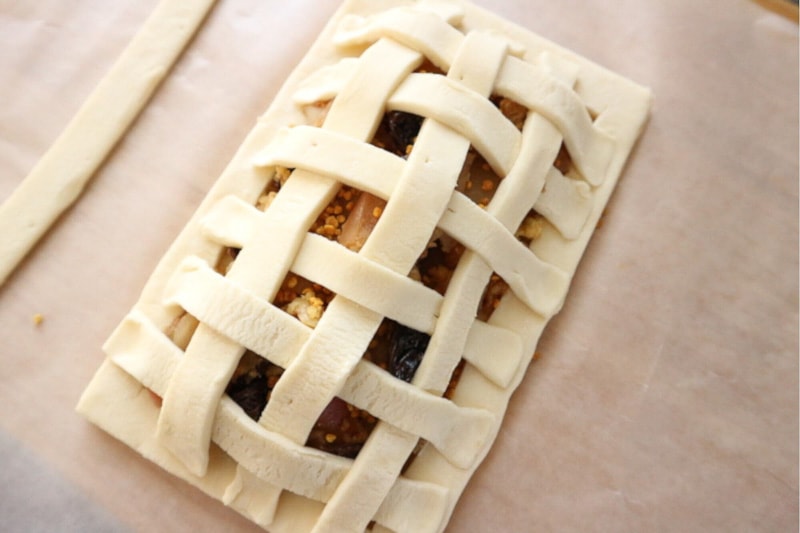 7. Arrange the pastry strips from Step 4 in a lattice pattern on top.