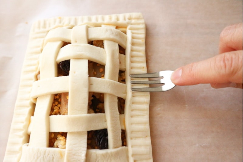 8. Brush the edges of the lattice with ingredients B, place the remaining cut border pastry on top, and press down with a fork to seal.