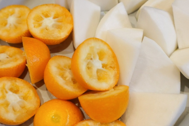 1.Cut the kumquats in half and remove the seeds. Peel the turnips and cut them into bite-sized pieces.