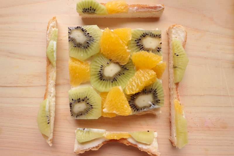 This can be made with strawberries on one slice and kiwi and orange on the other.