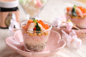 *Chirashi is sushi rice topped with assorted ingredients Ingredients (for 3 mini cups)Salmon (sliced): 6 slicesShrimp (cooked): 3 piecesSalmon roe (Ikura): 2 tabl...