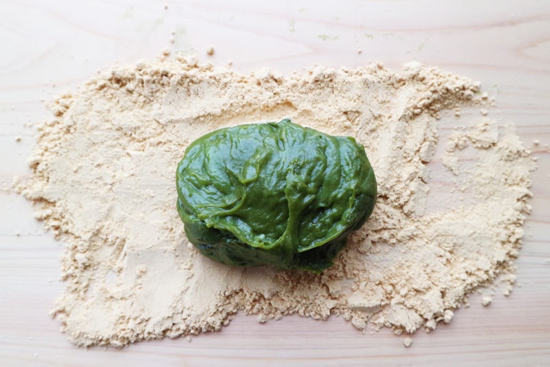 Add the Manuka honey to the cooked dough from Step 5 and mix well. While the dough is still hot, transfer it onto a cutting board dusted with kinako.