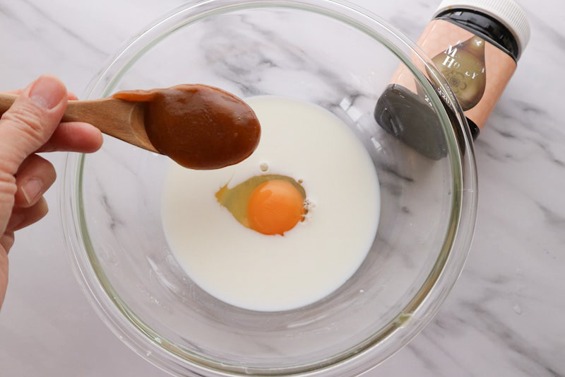 2.In a bowl, mix the egg, milk, and Manuka honey.
