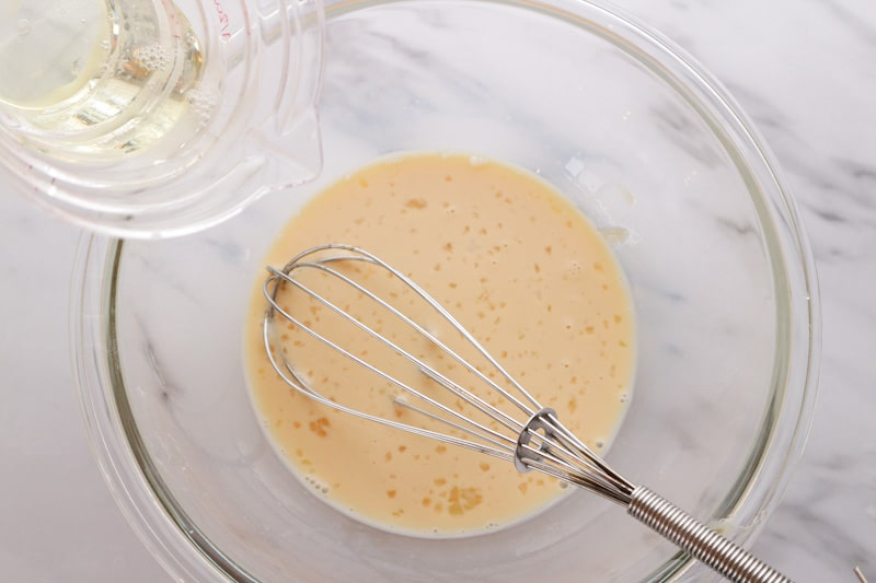 يُضاف الزيت النباتي ويُحرَّك حتى يتجانس الخليط.