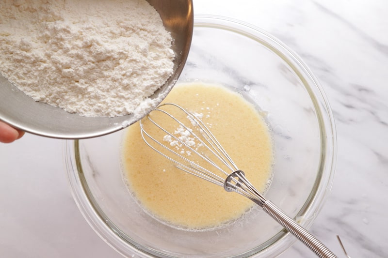 يُضاف خليط البانكيك ويُحرَّك برفق حتى يصبح خليطًا متماسكًا.