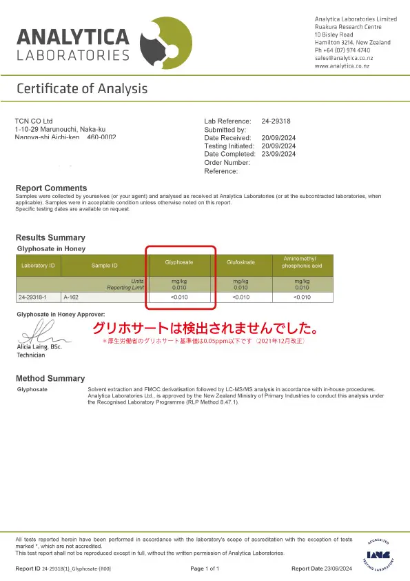 As shown in the certificates below, all samples tested negative for glyphosate. To continue earning your trust, we will update the test results  for the honey we use.
