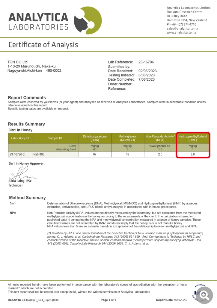 HMF (hydroxymethylfurfural), produced by heat, is regulated internationally to not exceed 40 mg per kg. We conduct tests both before departure from the local origin and after arrival in Japan to ensure that our products meet these standards.