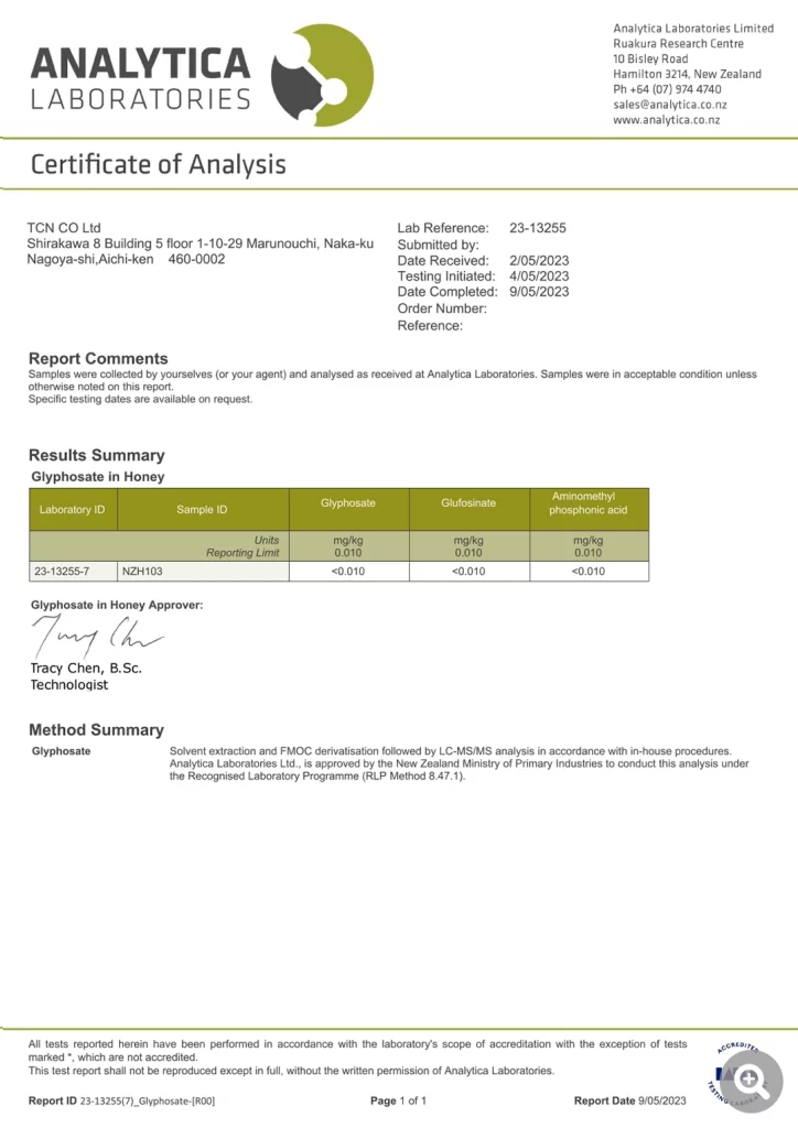 تخضع المواد الخام لاختبارات دقيقة لرصد المبيدات مرتين: قبل التصدير من نيوزيلندا، وعند وصولها إلى اليابان. ونضمن مطابقتها لمعايير السلامة الدولية، بما في ذلك مستويات الغليفوسات. في اليابان، تُجرى الاختبارات على أيدي منظمة Eurofins QK En Japan Inc. المعتمدة من وزارة الصحة والعمل والرفاه، أما في نيوزيلندا، فتُنفَّذ الاختبارات في مختبر ALS Food and Environmental NZ المعتمد رسمياً من الحكومة.
