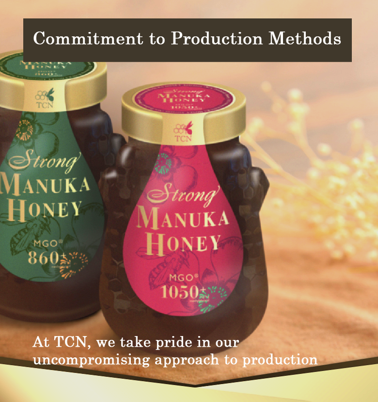 To prevent quality degradation from ultraviolet light and ensure safety from chemicals released by plastic containers, we use high-preservation glass light-blocking containers. The use of ‘Japanese-made light-blocking glass containers’ for New Zealand Manuka honey is a first-time initiative by TCN.
