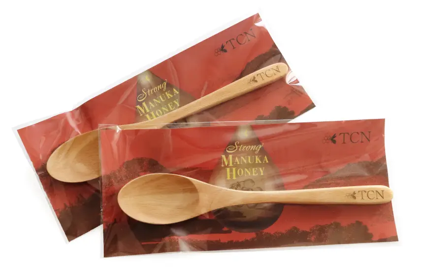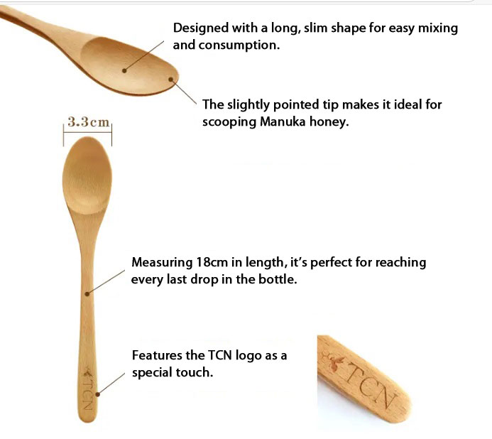 The Manuka honey spoon was designed by TCN from the ground up. To ensure ease of scooping, the tip is shaped to be thin and pointed.