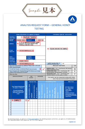 After filling out the necessary fields, this form will be included with the sample (Manuka honey) when sending it for testing